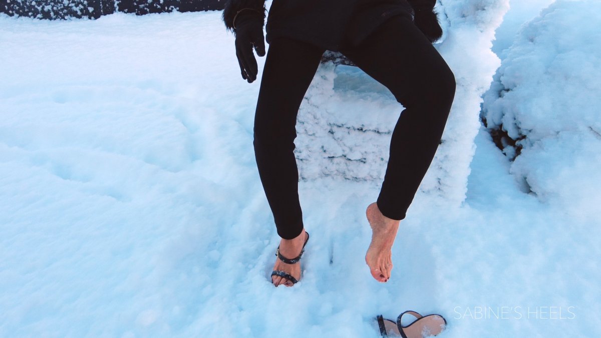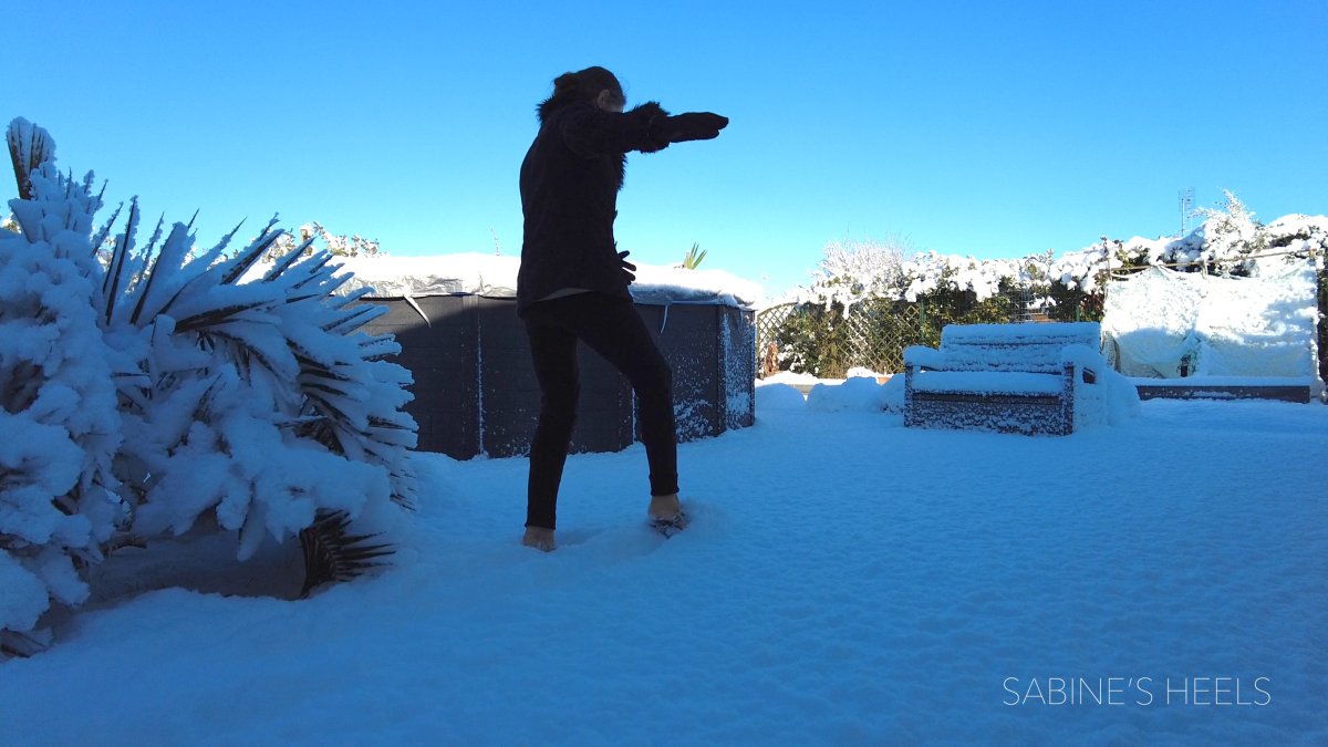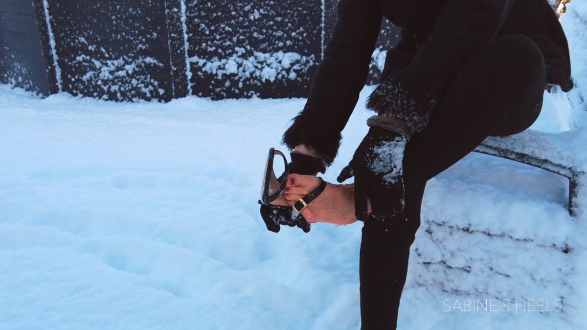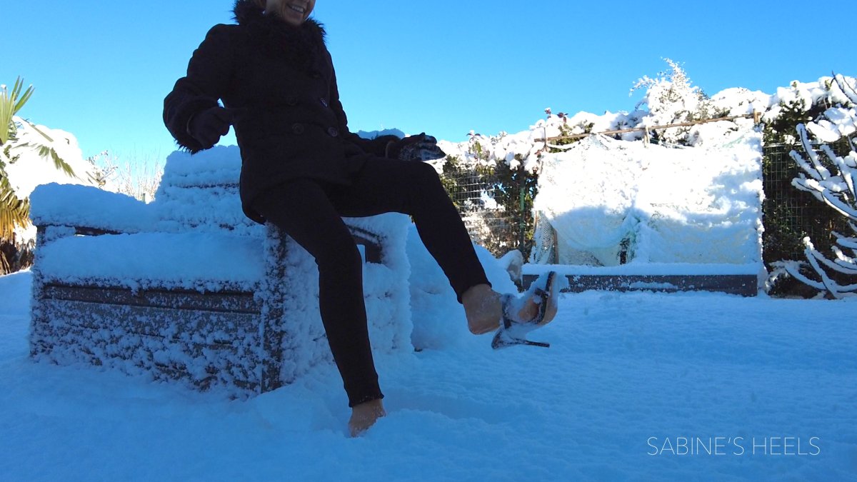 It snowed a lot at my place and I decided to take a walk in the garden in 13cm mules! After a short walk and playing with my mules in the snow, my feet are really, really cold and I decide to go home to warm them up.