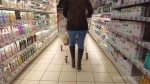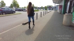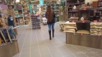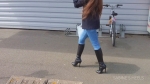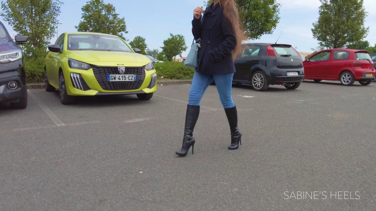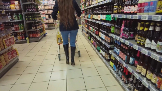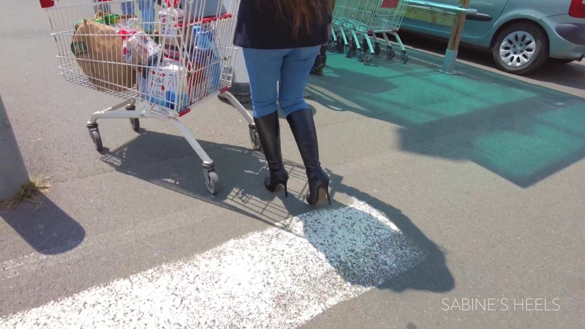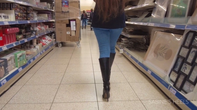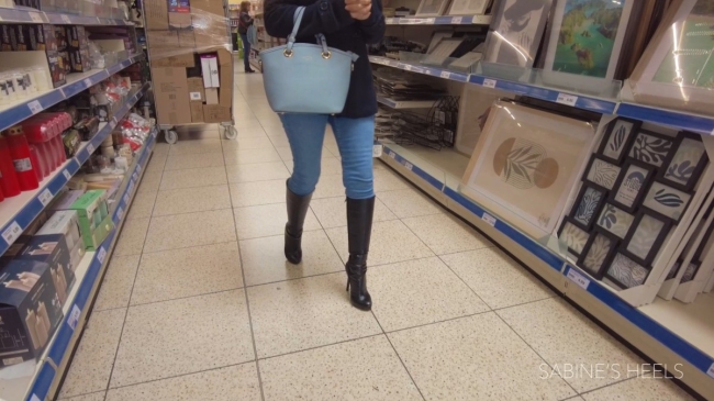 I'm walking in a store wearing 12cm black leather boots and jeans