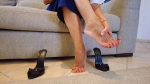 I'm wearing my fluffy mules and a sheer black dress, and I'm reading a book on my sofa. With dreamy music playing in the background, I'm swinging my feet and my mules for your pleasure.
