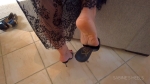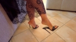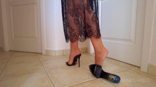 Complete video of walking and dangling in all sorts of ways. Close-ups of mules being worn while sitting and standing, with a lace skirt.