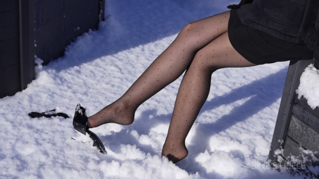 It snowed a lot at my place and I decided to take a walk in the garden with my PLEASER DOMINA  mules! After a short walk and playing with my mules in the snow, my feet are really, really cold and I decide to go home to warm them up.