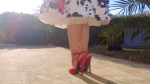 I'm walking around my house in a vintage dress and 6-inch red sandals. My feet hurt because of a blister that burst at the beginning of the video.