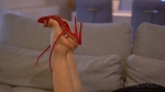 RED SANDALS AND WRINKLED FEET DANGLING ON SOFA