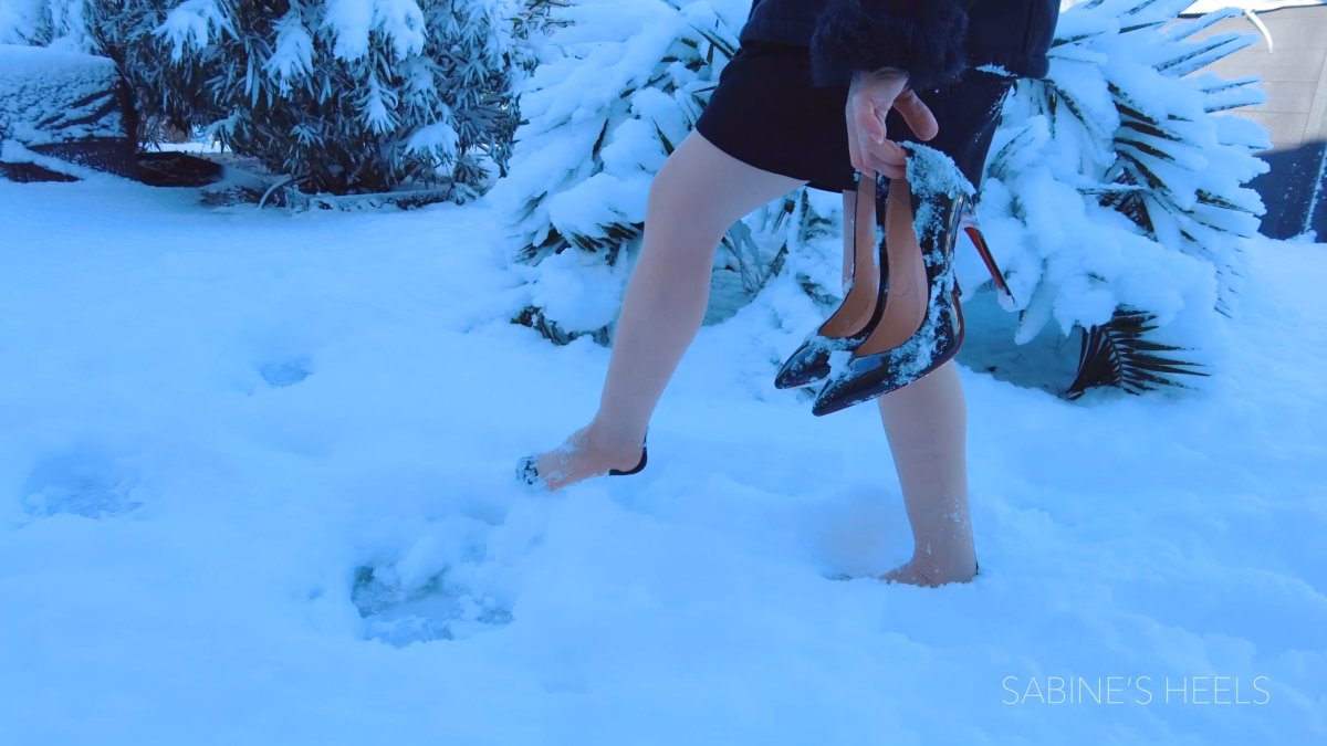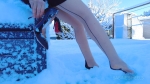 It snowed a lot at my place and I decided to take a walk in the garden with my resoles pumps and seamed nylons ! After a short walk and playing in the snow, my feet are really cold and I decide to go home to warm them up.